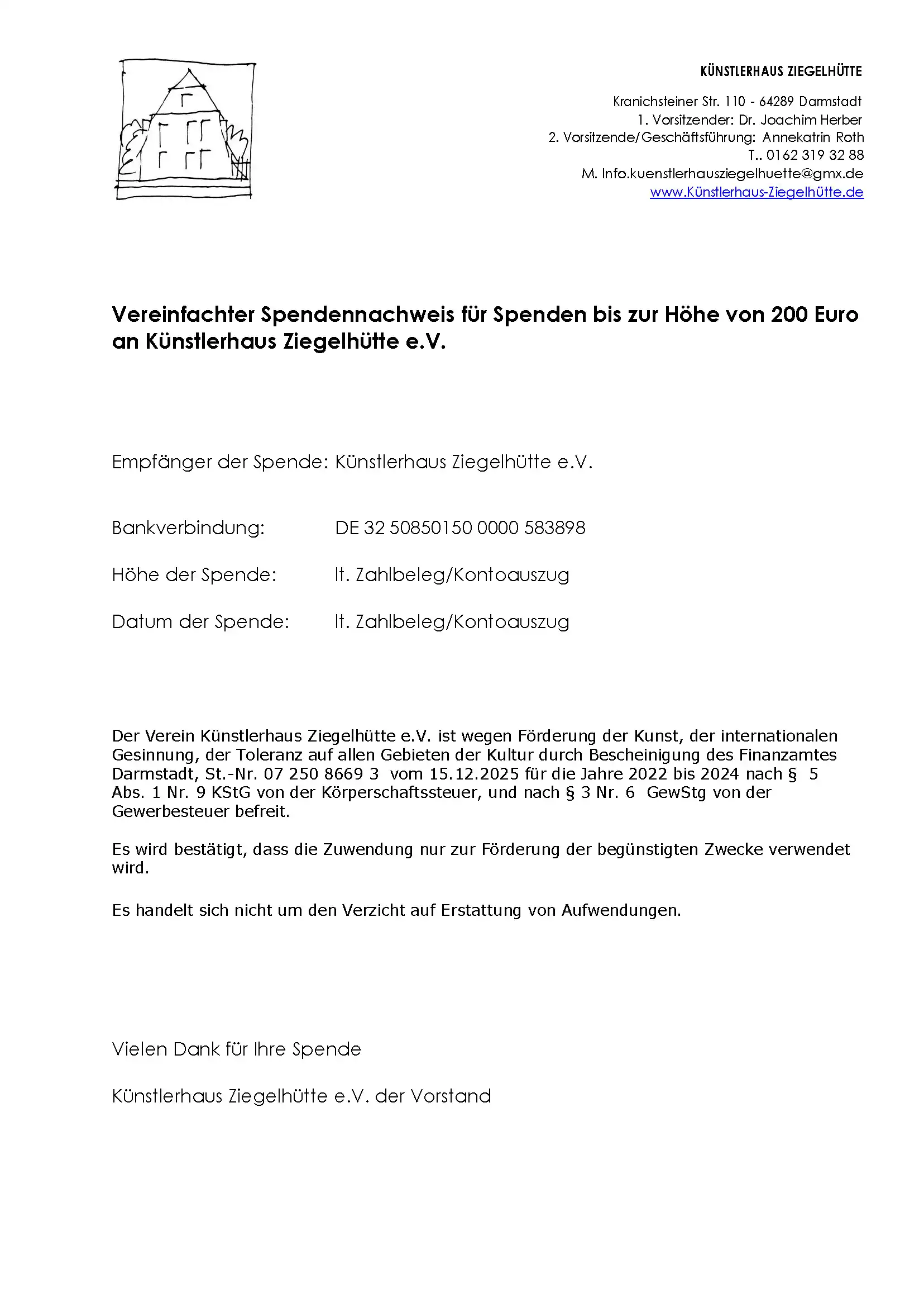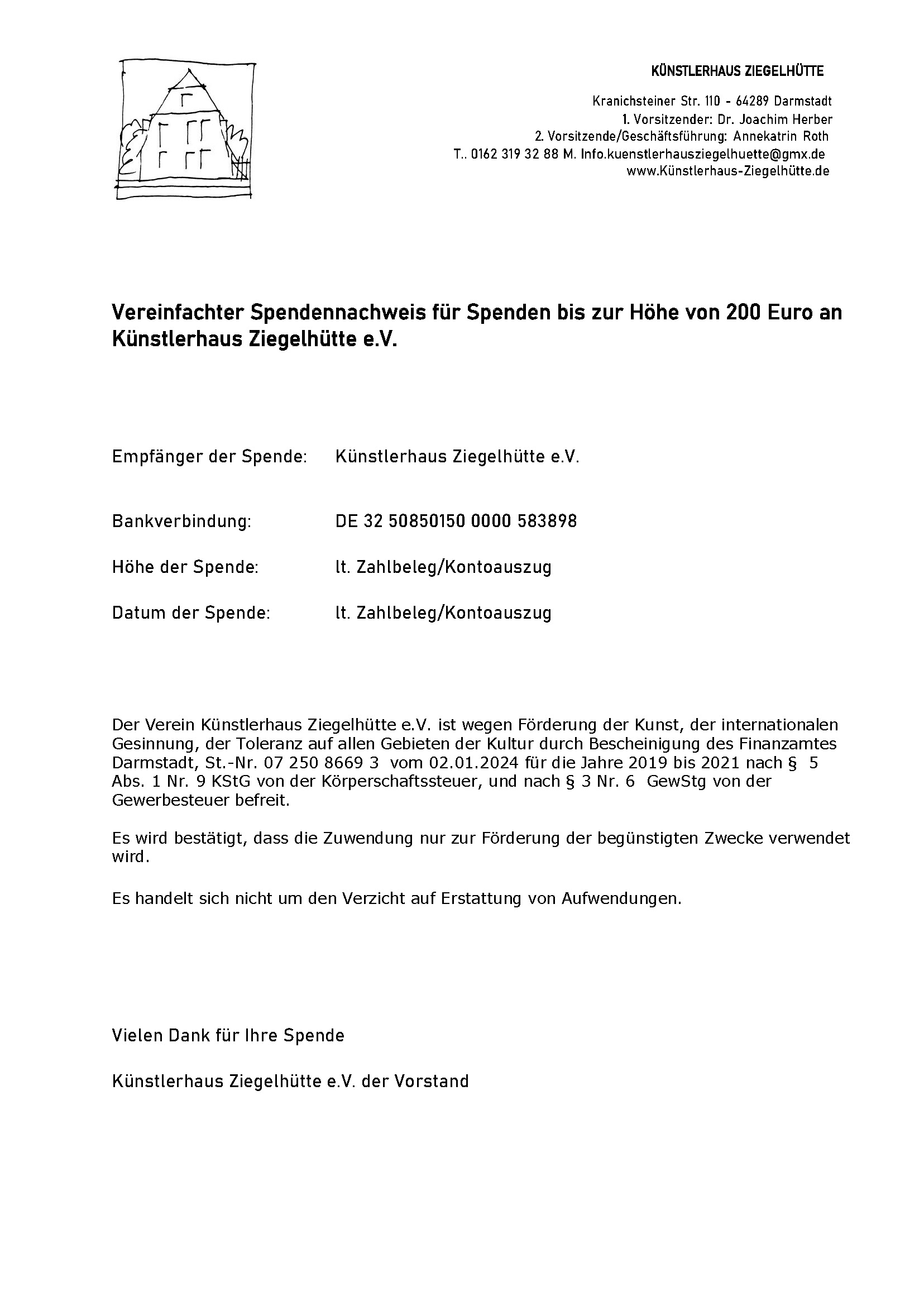 Wir bedanken uns für Ihre Spende an Künstlerhaus Ziegelhütte e.V.